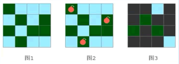 每颗炸弹爆炸后,可以波及到炸弹所在的小方格,及相邻的上、下、左、右小方格;